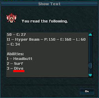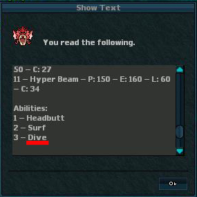 A habilidade Dive é necessária para explorar as hunts debaixo d’água, encontre o Redemoinho no mar (Whirlpool) e entre nele, o dive também pode ser usado como Ride debaixo d’água.